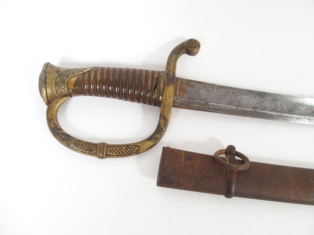Sabre réglementaire Français d’officier d’artillerie modèle 1829. Monture en bronze doré à décor floral, fusée en corne filigrane laiton. Lame courbe à gorge, signée Klingenthal au dos, fourreau tôle d’acier à deux bracelets (à repolir).