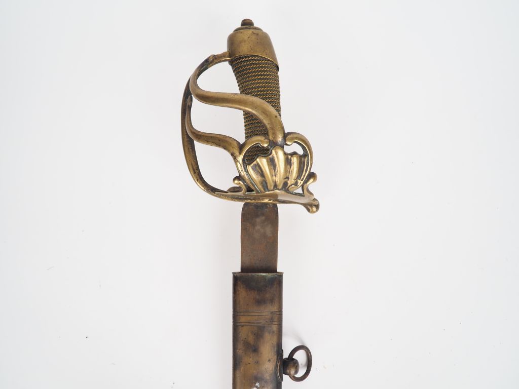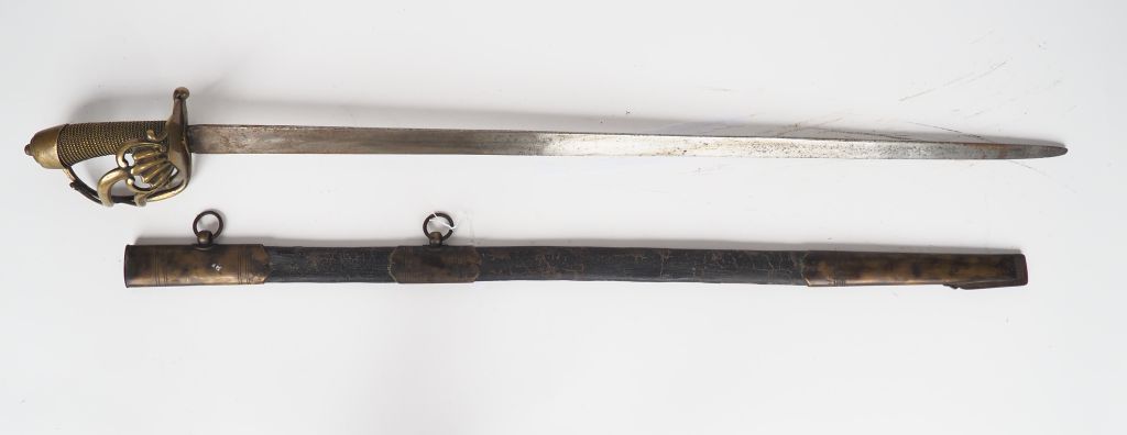 Sabre supposé (d’après Michel Petard tome 1er . "Des sabres et des épées" page 124 référence 115 U) de la compagnie à cheval de la garde du directoire ou de la gendarmerie (1798-99). Monture en bronze fondu, calotte à longue queue de forme ronde, forte coquille symétrique ajourée comme le plateau, branche de garde principale plate poinçonnée « VERSAILLES » fusée en bois habillée de chagrin et filigranée .Lame courbe à dos plat, à gorge et à gouttière au centre de la lame (forme différente de l’exemplaire décrit par Michel Petard ).Longueur totale 1015 mm. Dans son fourreau en tôle d’acier habillé de nombreuses garnitures laiton (chape et bracelets portant pitons et anneaux, longue bouterolle à dard acier joignant le bracelets par deux attelles laiton courant sur la tranche du fourreau rigidifiées par des bracelets, ce type de fourreau faisant plutôt penser à un sabre de gendarmerie. Etat 1.