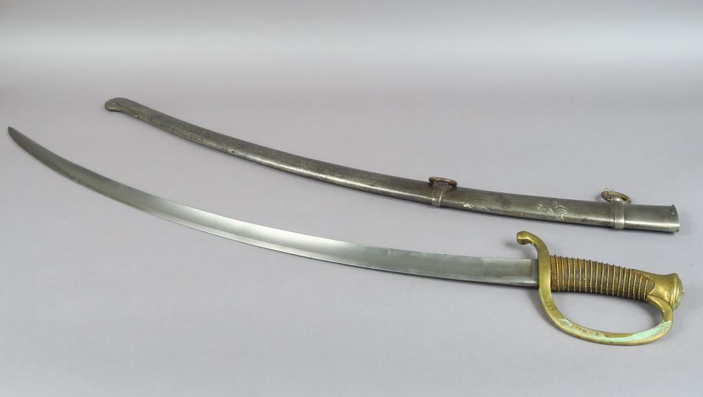 Sabre troupe de canonnier monté modèle 1829, fabrication "Manufacture Royale de Châtellerault Septembre 1834". Lame à la Montmorency à gorge, dans son fourreau à deux bracelets. Monture bronze, fusée bois filigranée. Etat 2.