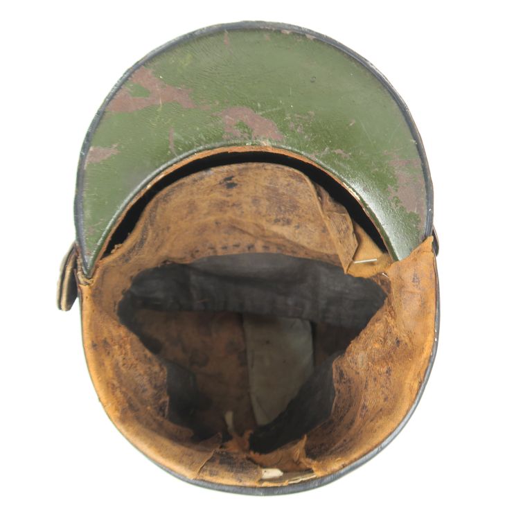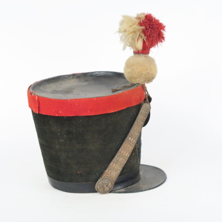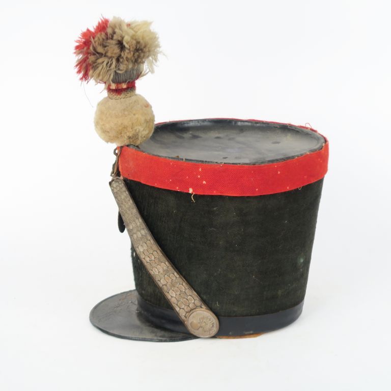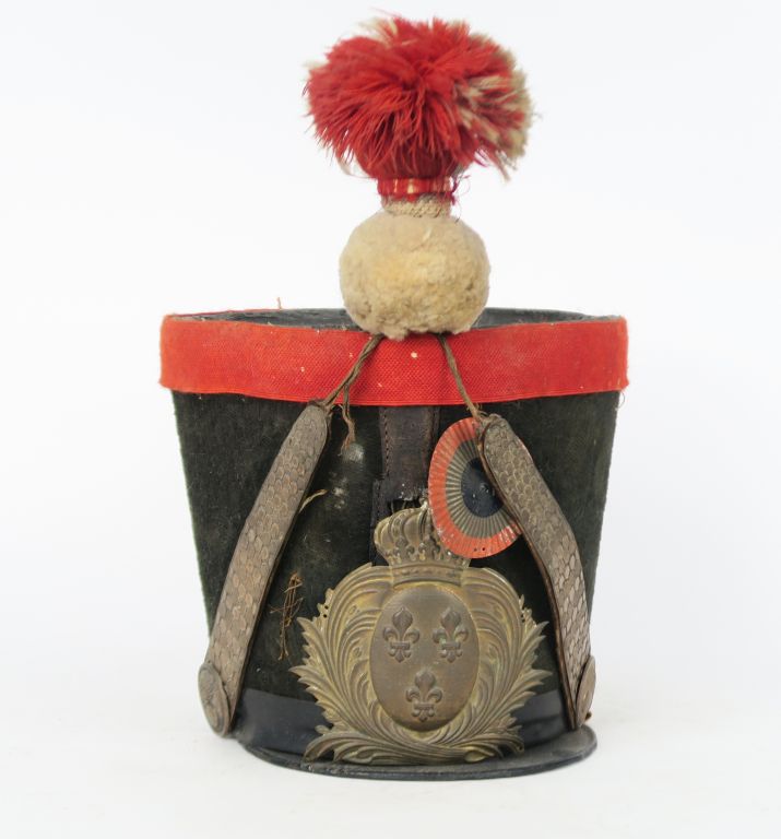 Shako de la Garde nationale. Recouvert de drap noir taupé à galon cul de dé écarlate remonté et bourdalou verni. Calotte et visière vernis Plaque aux armes de France en laiton. Pompon flamme en laine écarlate et blanc. Coiffe intérieure en basane et et toile enduite. État moyen. (Composite, plaque postérieure, accidents). Époque Monarchie de Juillet.