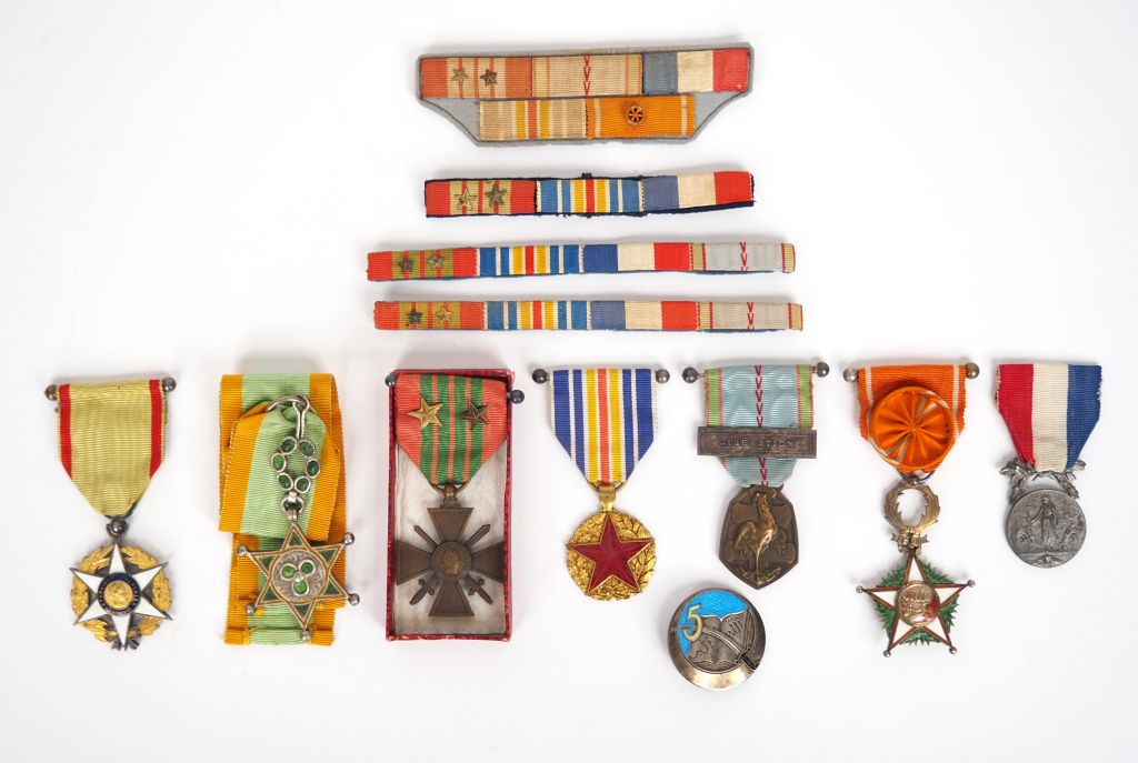 SOUVENIRS DE LA FAMILLE MIQUEL et d’Eugène MIQUEL, commandant le 5e RTA. -Croix de commandeur d’un ordre de fantaisie, probablement saharien. En métal argenté et émaillé. Cravate. 85 x 41 mm. -Croix de guerre 14-18. Avec ruban 2e GM à deux étoiles. -Officier de l’ordre du Ouissam Alaouite (Maroc). En vermeil et émail (éclats).B. -Médaille des blessés. -Médaille de dévouement du ministère de l’Intérieur. En métal argenté. Ruban. -Chevalier du Mérite agricole. Uniface. En métal et émail. ` -Commémorative 39-45. Agrafe Libération. -On y joint quatre rappels de décoration. -Insigne du 5e RTA en argent. Dos guilloché Dragon Paris Nice. Épingle déformée et attache bijoutier incomplète. Historique : Chef de bataillon Eugène Adrien MIQUEL (mort pour la France le 17/04/1955 à Khanga Sidi Nadji lors d’un accrochage, comme commandant le 5e régiment de tirailleurs algériens.)