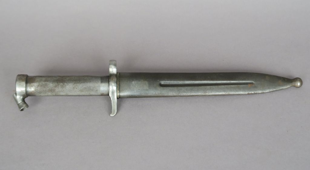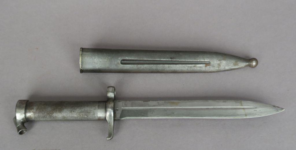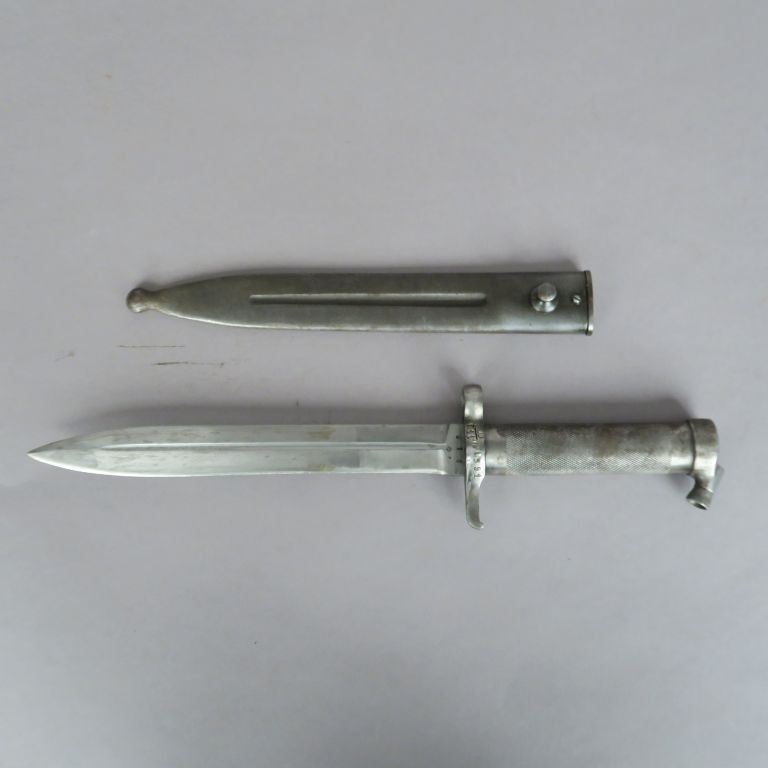 SUÈDE Baïonnette modèle 1896. Poignée ronde quadrillée, pommeau avec verrouillage. Croisière matriculée. Lame poinçonnée et fourreau bronzé, à gouttières. A.B.E.