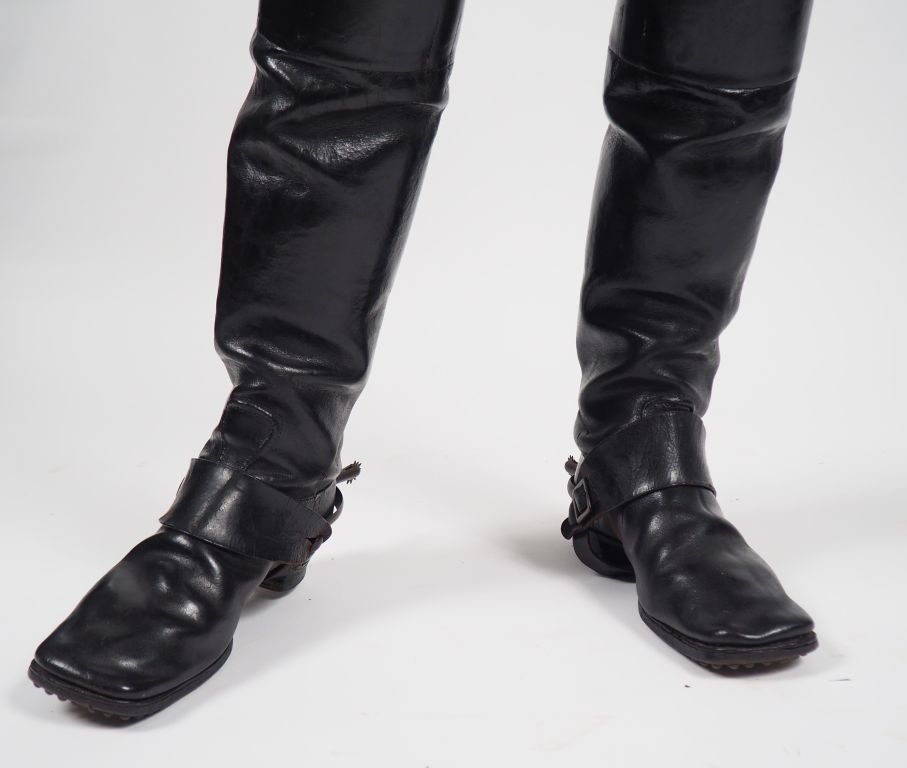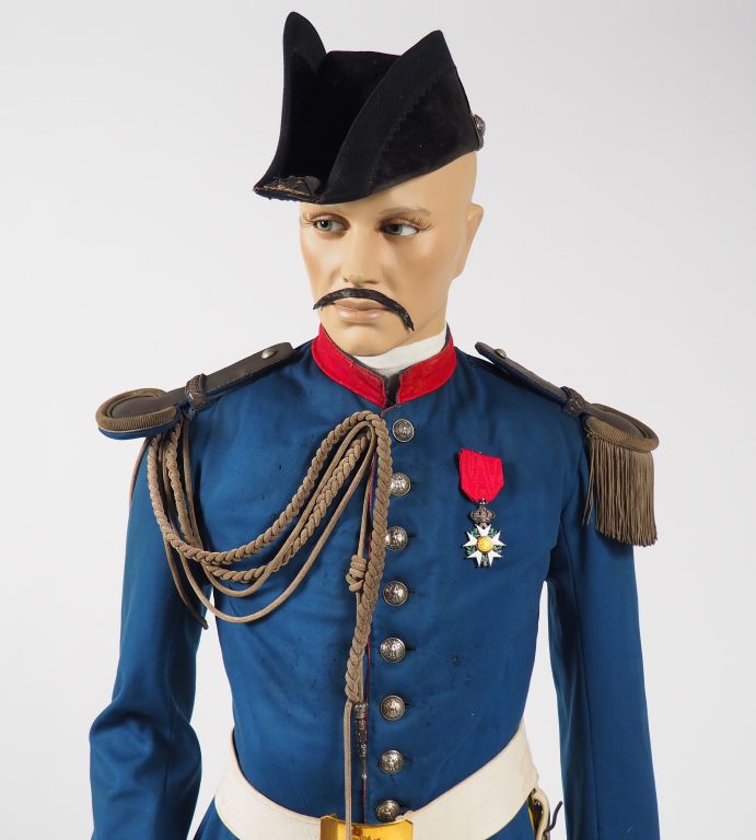 Superbe mannequin d’un officier (capitaine) des cuirassiers de la Garde Second Empire, tunique en fin drap bleu céleste à doublure rouge (1863/1865), collet droit et parement de manche rouge garance. Boutons bombés argent à l’aigle impériale couronnée et marqués « Garde impériale ». Aiguillettes argent à deux ferrets à décor d’aigle non couronnée, large ceinturon (65 mm) en buffleterie blanche avec sa sangle porte sabre, piqure et bourrelet typique de la Garde sur le cuir, plateau rectangulaire en laiton à pans coupés, et à la grenade enflammée (80 x 100 mm). Pantalon en drap blanc, bottes à l’écuyère fabrication « Au sabot rouge » en cuir noir à haute tige et bout carré avec éperons indépendants laiton à molette fer. Bicorne en taupé noir à ganse noire également, galon plat argent en passementerie de canetille, bouton bombé argent à l’aigle couronnée et marquage « Garde impériale ». Cocarde tricolore plissée, deux floches argent captives aux pointes de la coiffure, intérieur garni de soie brune, bandeau anti transpirant en fin cuir fauve, marquage au fond de la bombe, doré au petit fer, « Magnien 273 rue st Honoré Paris », la tunique arbore une croix de chevalier de la Légion d’honneur Second Empire. Cette tunique est marquée sur la doublure à l’encre noir « Dieudonné » (on retrouve un Louis Christian Isidore Dieudonné sous-Lieutenant le 4 Juin 1848 au 2eme de carabiniers élevé au grade de Lieutenant le 11 Mars 1854 dans le même régiment, capitaine le 30 Octobre 1856 et capitaine-commandant en 1862. Affecté en 1863 au 2ème Cuirassiers de la Garde. Retiré en 1867, chevalier de la légion d’honneur, titulaire de la médaille d’Italie). Etat1