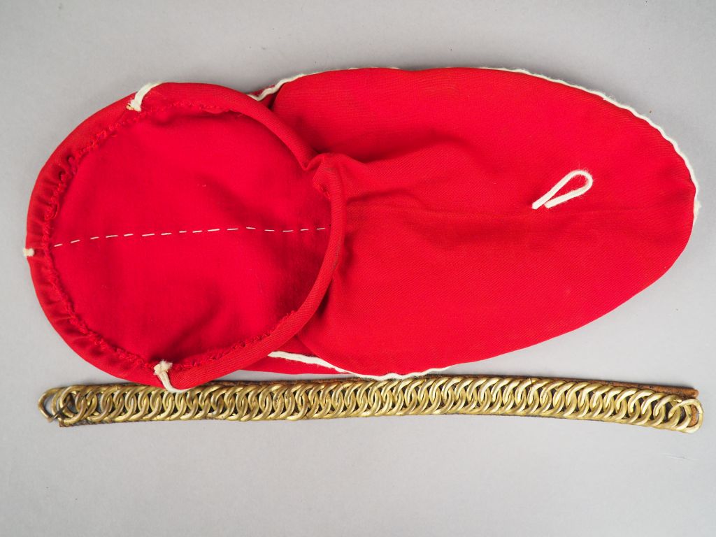 Talpak troupe de hussard Second Empire, fût habillé d’astrakan noir, carcasse cuir recouverte de la fourrure. De chaque côté de la partie inférieure de la coiffe on trouve un crochet laiton monté sur une pastille (crochet de mentonnière). Absence du crochet en haut à droite de la coiffe. Crochet de cordon-raquette à l’arrière. Flamme du talpak en drap écarlate passepoilé blanc (reconstitution ancienne). Pompon en laine écarlate de forme ovale, hauteur 7 cm, largeur 4,5 cm, monté sur une double tiges en fil de fer. Mentonnière composée d'une jugulaire à chaînette laiton sur canapé cuir (manques). Coiffe intérieure en cuir ciré noir découpé en sept dents de loup. Etiquette récente collée « ALEXIS GODILLOT » « 2eme Régiment de hussards ». Coiffure remontée avec des parties anciennes. Etat 1.