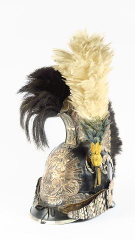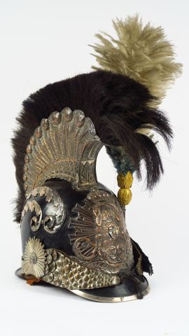 Très convoitable casque de garde du corps du Roy 1ere restauration (Juin 1814-Mars 1815) Bombe, visière et nuquière en cuir noir, visière doublée de cuir vert et renforcée par un jonc de visière en tôle de cuivre argenté. Toutes garnitures en cuivre argenté, Grande plaque frontale au soleil rayonnant surmontée d’une couronne, on trouve à la base de la plaque un bandeau ondoyant portant la devise des gardes du corps du Roy « NEC PLURIBUS IMPAR » (A nul comparable).La bombe est décoré de volute de palmes de part et d’autre. Jugulaire à fausses écailles embouties sur canapé cuir fauve, tourillons de jugulaire au soleil rayonnant embossé. Cimier très arqué, décor d’une frise de plumage en relief, chenille noire surmontant l’ensemble. Porte plumet carré en laiton, plumet bicolore embase verte, corps probablement en plumes de cou de coq blanche. Coiffe intérieure en cuir dont la teinture noire à pratiquement disparu. Très bon état. Expert : Gilles Sigro : hautcomminges@orange.fr