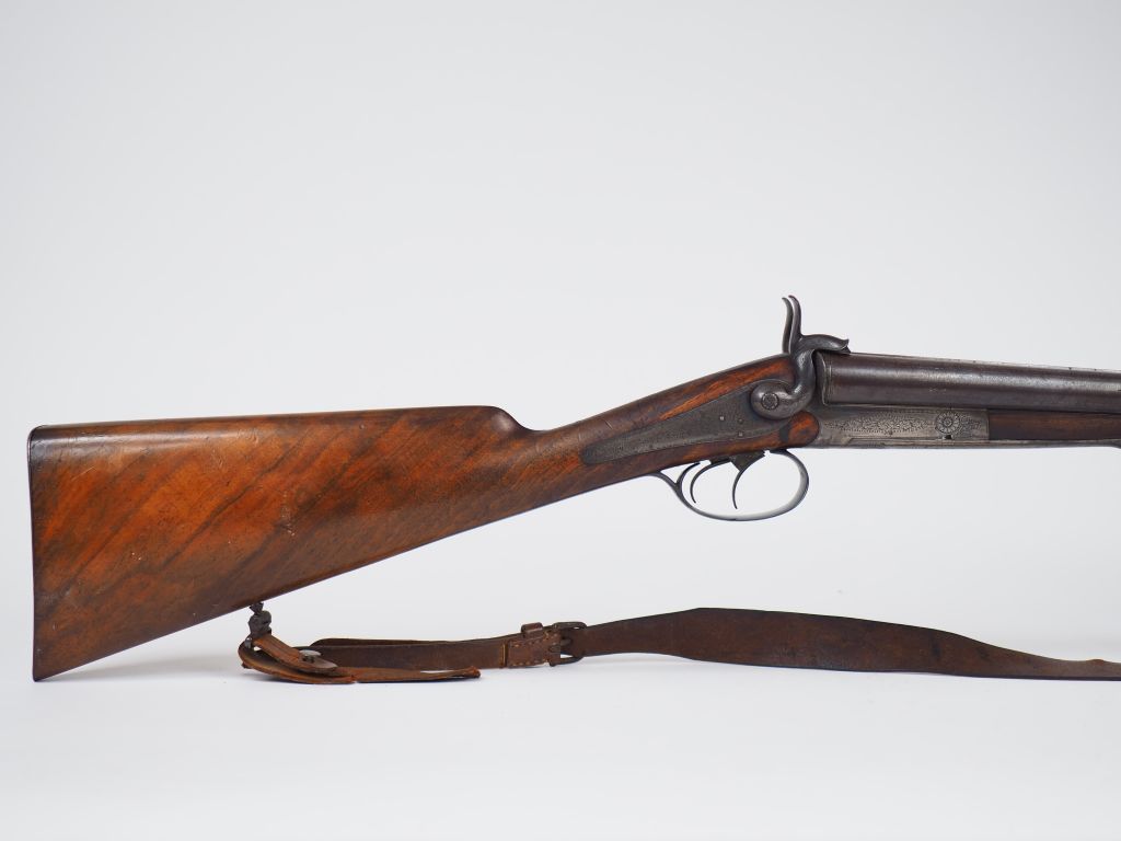 Très joli fusil juxtaposé à broche en calibre 16 nr 1475.Canons en damas de 760 mm de long dans leur polissage d’origine intact. Signature en lettres d’or sur la bande « Joh. Hoffmann in WR . Neustadt » (Wiener Neustadt en Banlieue de Vienne en Autriche). Devant bois imperdable, démontage des canons par pièce basculante. Garnie trempe au paquet, pontet long bronzé avec incrustation initiales gothique couronnées en or. Mécanisme fonctionnel, crosse anglaise en noyer vernis au tampon, plaque de couche tôle. Arme de catégorie « D » (Etat 1-état neuf)