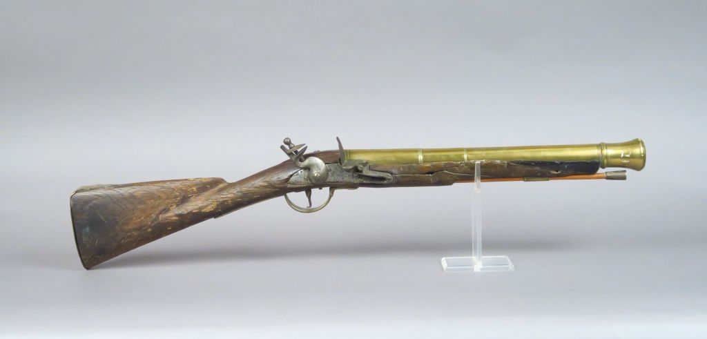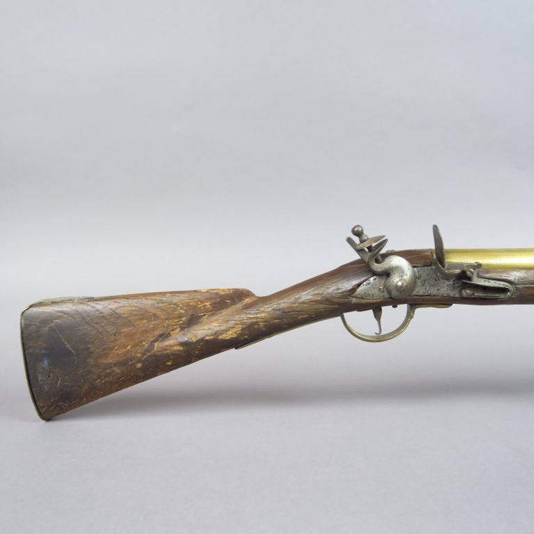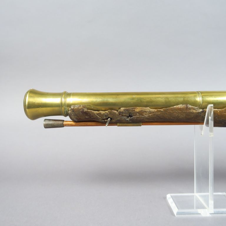 Tromblon à silex, tube bronze de 405 mm de long rond à moulures de renfort, bouche tulipée poinçon de réception Anglais sur le flanc gauche platine à corps rond, chien rond col de cygne, bassinet fer rond,