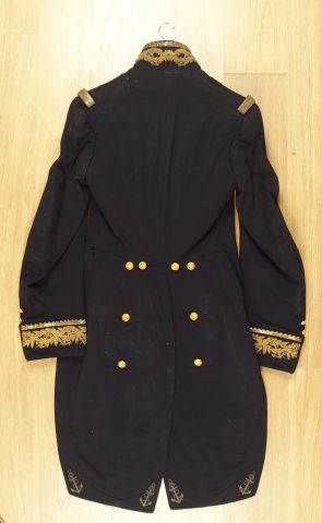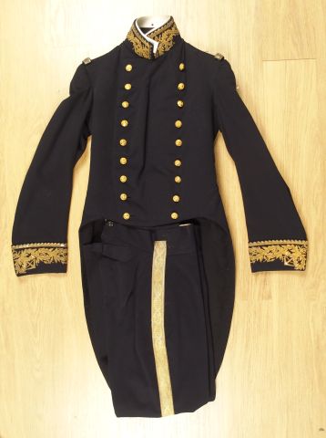 Uniforme de gala d'un officier de marine Français daté de 1862, fabrication tailleur en drap fin bleu marine (M Fontanières à Cherbourg), grades de capitaine de corvette au col, et aux manches en canetille d'or et sequins, avec son pantalon à passepoil or. 1.