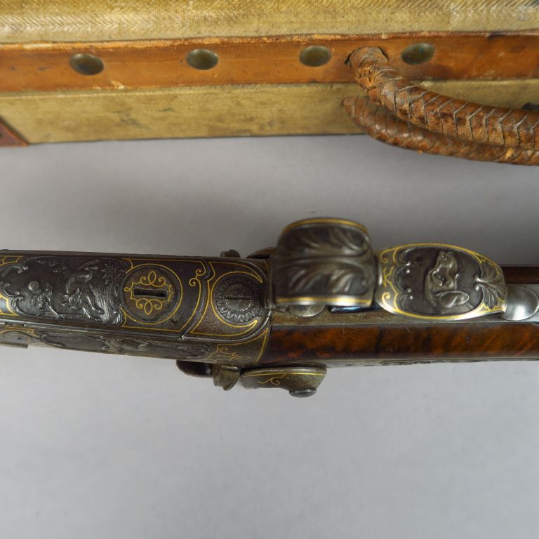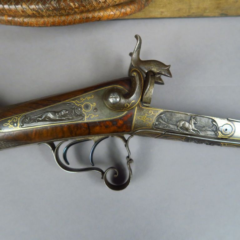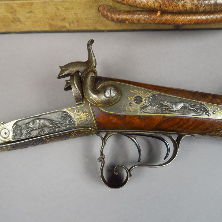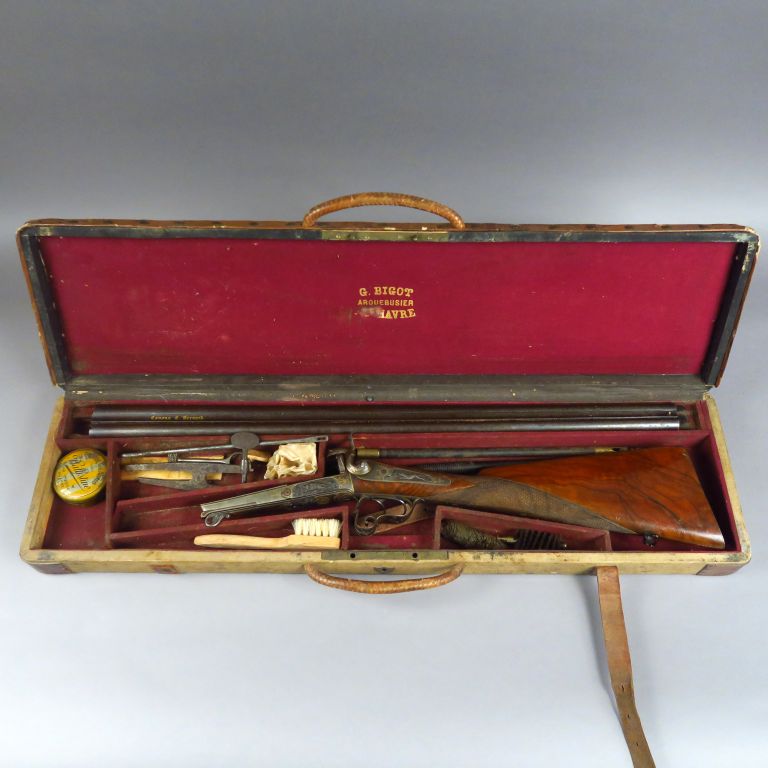 Valise en bois et toile à coin cuir contenant monté à l’anglaise par « G. BIGOT ARQUEBUSIER AU HAVRE » comme en atteste le marquage au petit fer sur le velours grenat du couvercle un fusil juxtaposé à broche calibre 16 de fabrication bourgeoise, garnie gravée (sculptée) de scènes animalières de belle facture, surlignage à l’or discrètement des contours des pièces (pontet, platines, plaque de couche etc.) Canons en damas chocolat de 705 mm de long, crosse anglaise de 360 mm de long quadrillée en noyer vernis au tampon, mécanisme fonctionnel. Coffret contenant en vrac un démonte ressort, un tire étui et tire carton, une baguette en 3 brins et une boite de graisse, ensemble intéressant témoignant d’une époque de chasse révolue !!Arme de catégorie « D ». Etat 1-