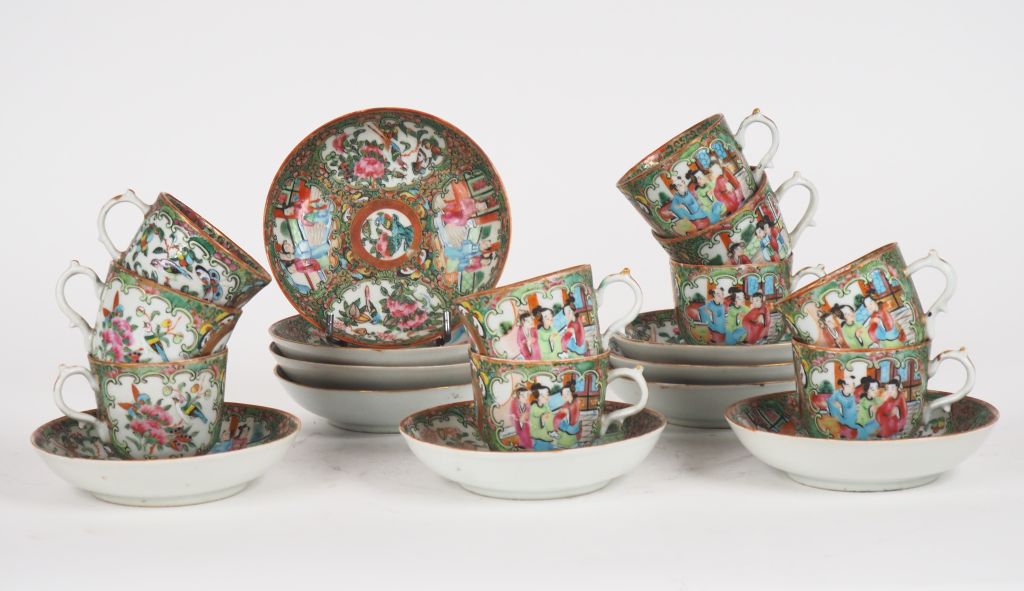10 tasses et sous-tasses en porcelaine et émaux polychromes de Canton style famille rose. Diam. 13,2 cm. (Egrenures)
