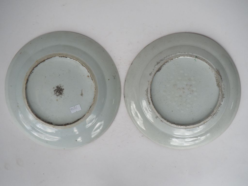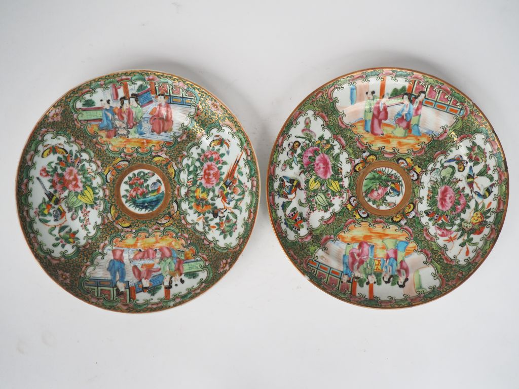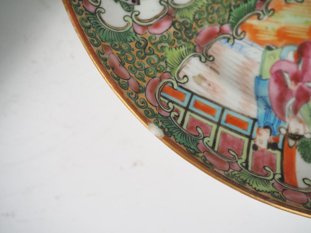 2 différentes assiettes en porcelaine et émaux polychromes de Canton style famille rose. Diam. 24 cm. (Egrenures).