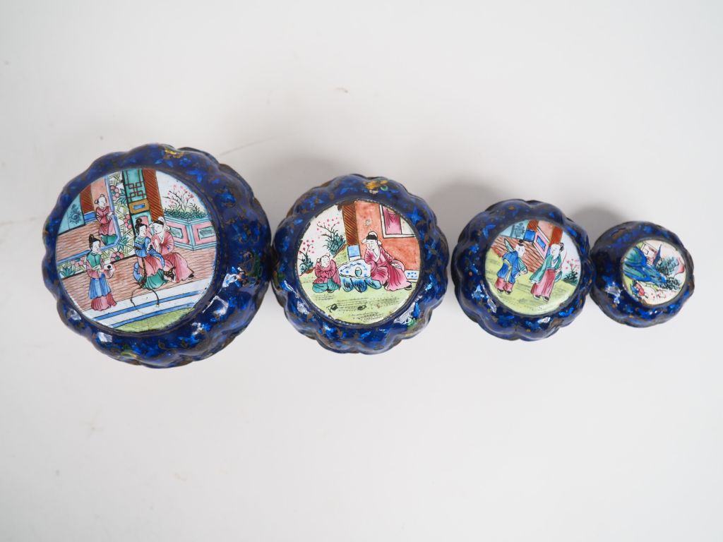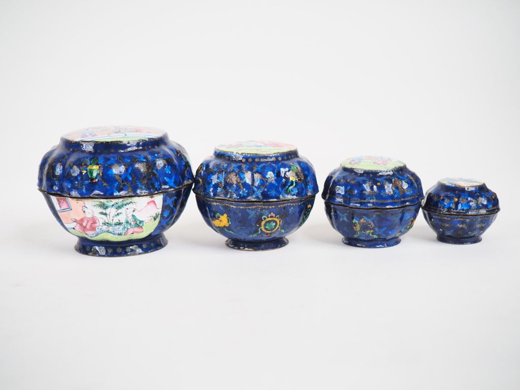 4 boites en métal émaillé à décor de personnages dans des réserves sur fond bleu.