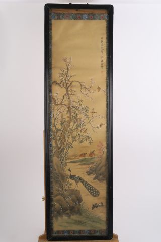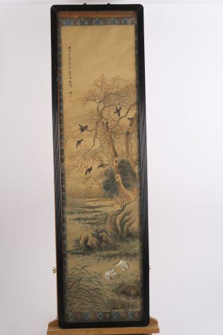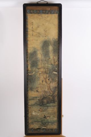 4 peintures sur papier, à décor d'oiseaux et de végétaux (mauvais état). 82 x 25 cm