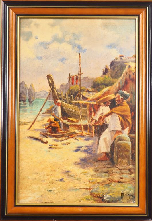 Albert CEZARD. "Pêcheurs sur les bords de la baie d'Halong". Huile sur isorel signée en bas à droite. Dim. 37 x 24 cm.