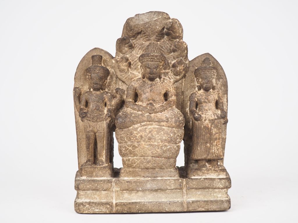 Angkor, fin XIIe - début XIIIe siècle, Triade bouddhique en grès gris foncé représentant sakyamini, sa mandorle représentant Mucilinda avec ses boddhisattva de part et d’autre Dim. 26 x 21 cm
