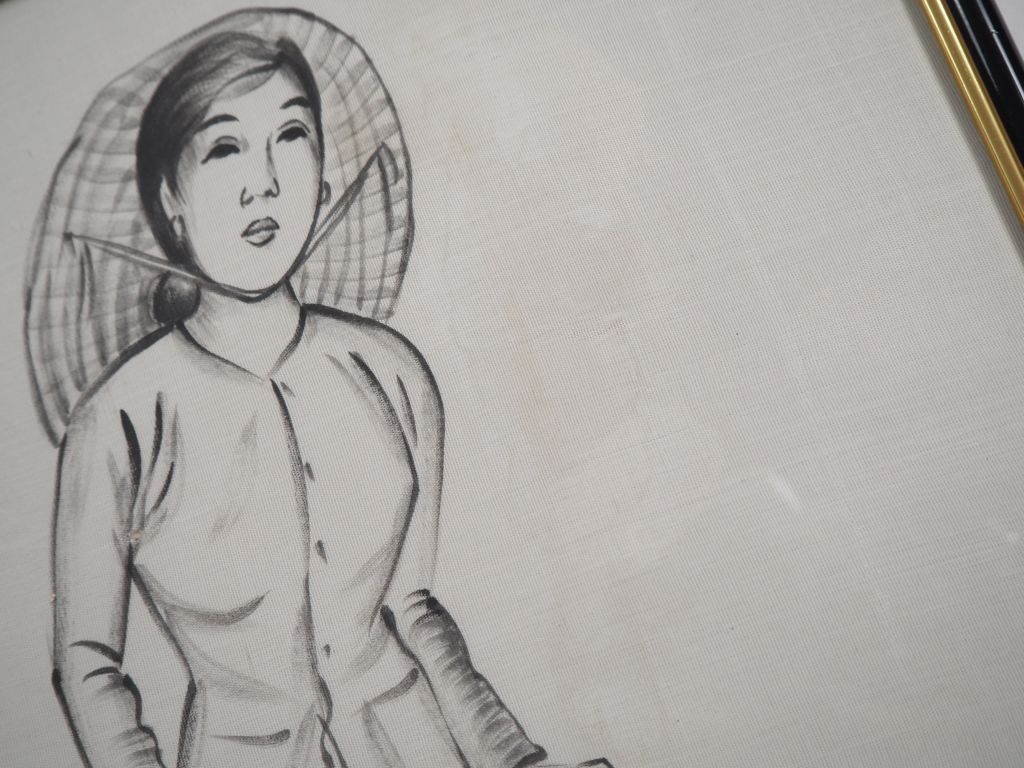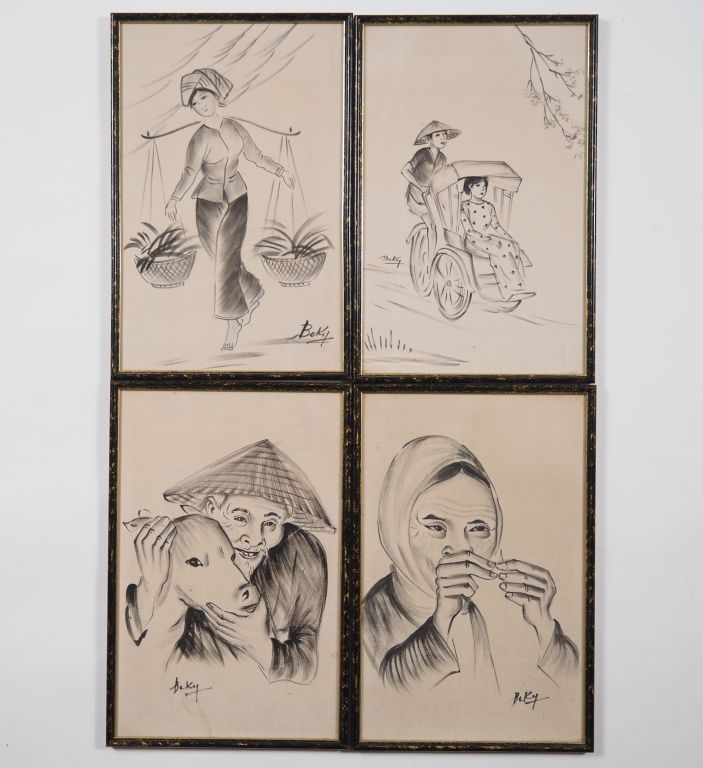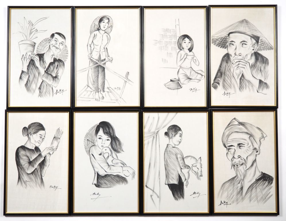 BEKY (1938-) Douze encres sur soie, représentant des personnages dont portraits d’hommes, jeune femme du retour des champs… Signées Beky Dim. 36 x 23 cm