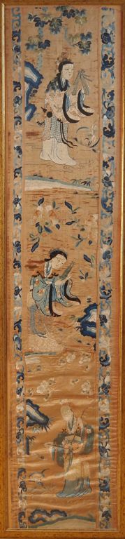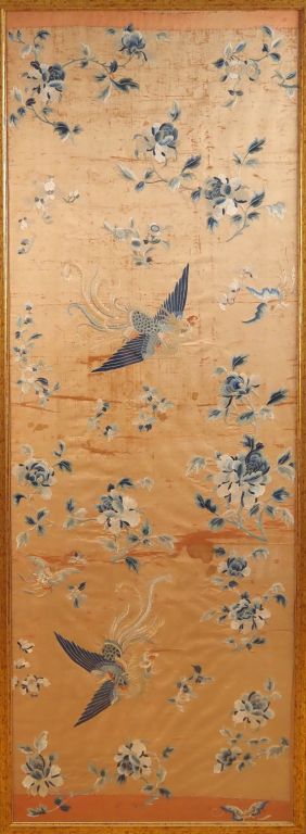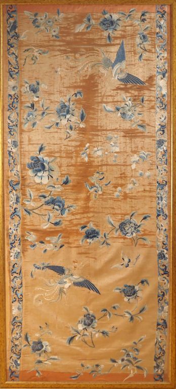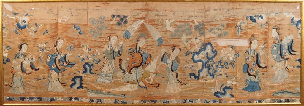 Bel ensemble de 5 panneaux en soie et lin brodé richement décoré dans des camaïeux de bleu sur fond corail, représentant la déesse Xiwanmu sur un échassier, entourée de ses adorants, on retrouve également des phenix, des immortels, compositions florales (fleurs de lotus, pivoines, pins de longévité). Chine vers 1860. Dim. 72 x 200 cm. Dim. 195 x 90 cm. Dim. 179 x 42 cm. Dim. 177 x 44 cm. Dim. 180 x 72 cm.