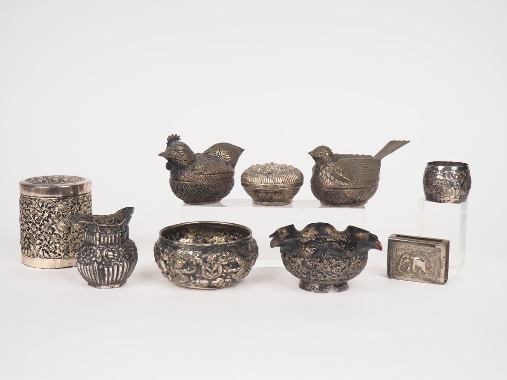 Birmanie, fin du XIXe siècle, Lot en argent repoussé comprenant neuf pièces, dont quatre boîtes couvertes (deux reprenant la forme d’une poule et d’une caille) deux coupes dont l’une floriforme, un étui à briquet et un rond de serviette à décor de danseurs, fleurs et feuillages. H. 3,5 à 9 cm Poids. 483 gr