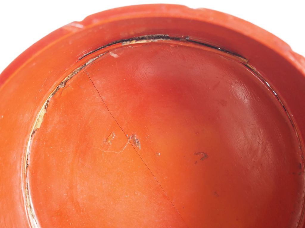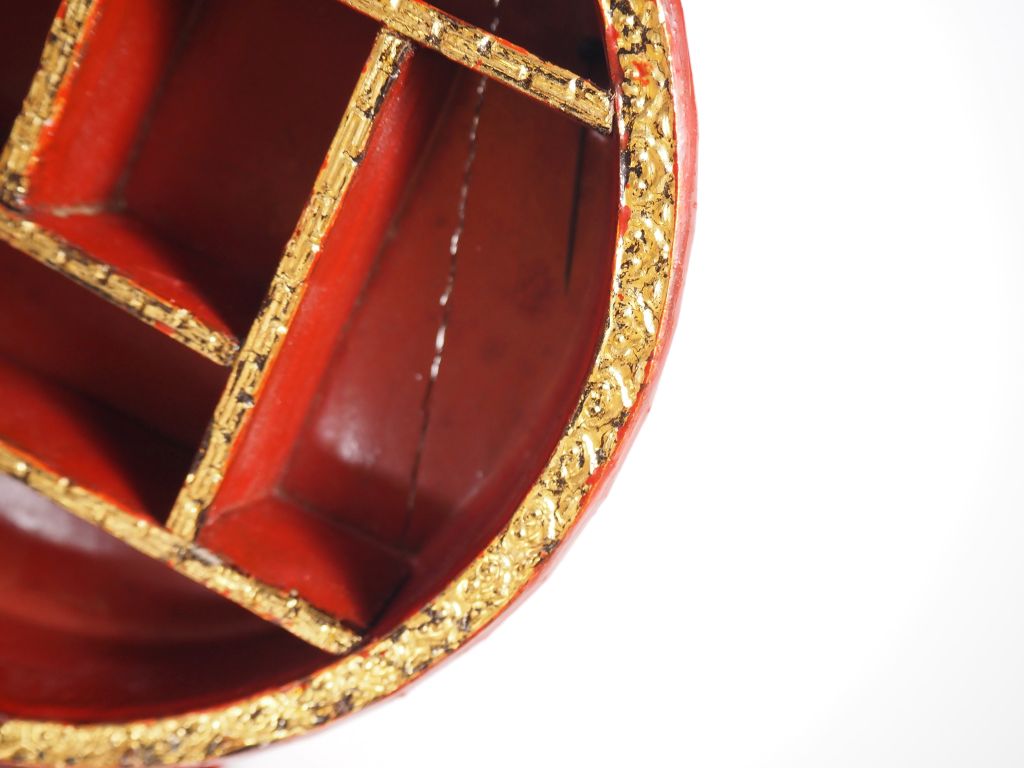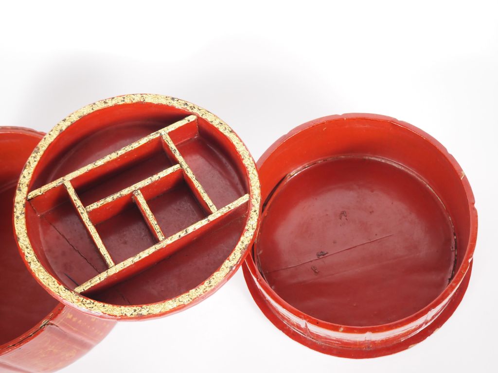 Birmanie, vers 1900 Boîte circulaire en laque rouge, à décor de scènes de personnages, fleurs et végétaux, ouvrant sur des raviers à friandises. Diam. 19 cm