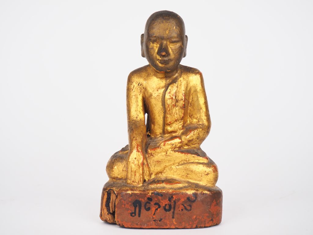 Birmanie, XIXe siècle Bonze en bois laqué doré et traces de polychromie rouge assis en prise de la terre à témoin. H. 17 cm