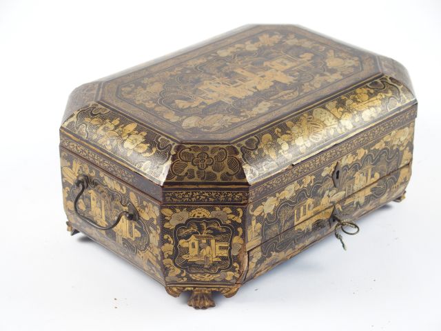 Boite à coûture en laque de Canton, à décor de terrasses animées de personnages sur fond noir. Vers 1880 (manques et accidents, sauts de laque)