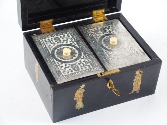Boite à thé en laque de Canton, à décor laqué or sur fond noir de dignitaires , contient deux flacons en étain. Chine vers 1880/1900 (petites rayures)