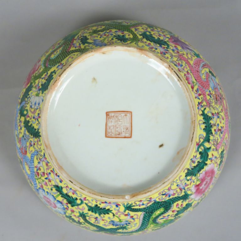 Boite couverte en porcelaine et émaux de la famille rose, décor sur fond jaune de dragons parmi des pivoines, clématites et lotus. Marque apocryphe Qianlong sur la base. Chine, Xxème siècle. Diam. 28 cm
