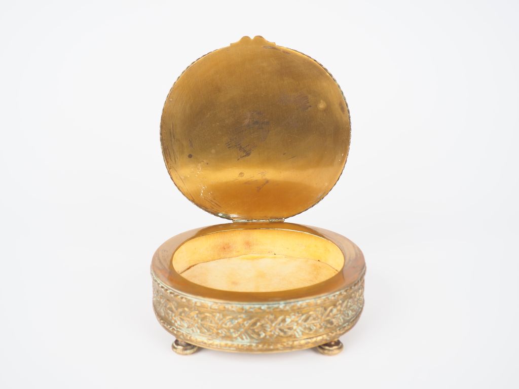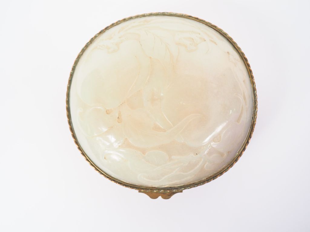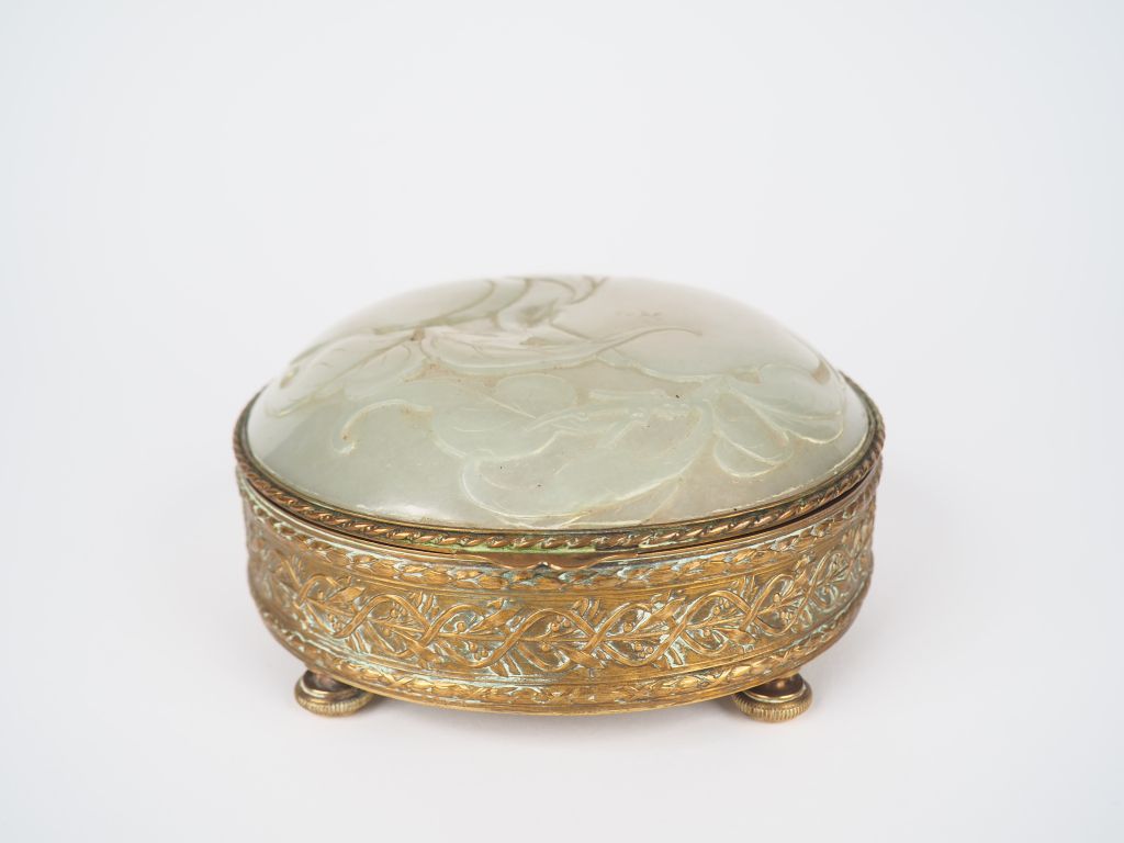 Boite ou écrin en cuivre finement ciselé orné d'une plaque en jade céladon sculpté d'une pêche de longévité auprès de laquelle évolue une chauve souris. plaque datée Chine XVIIIème Dim. 12,5 x 13 cm