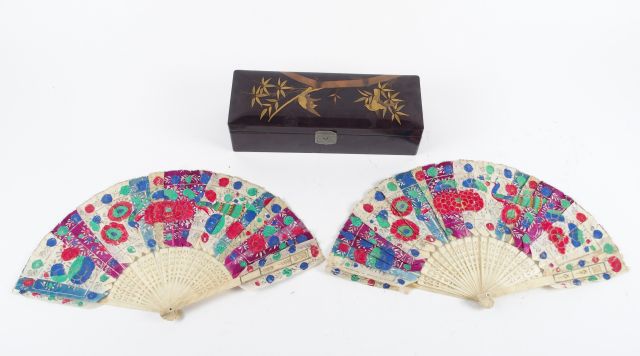 Lot de Boite rectangulaire en laque et 2 éventails indochinois en plume et os au prix de 20 à 30 € en vente aux enchères par l'hôtel des ventes Primardeco