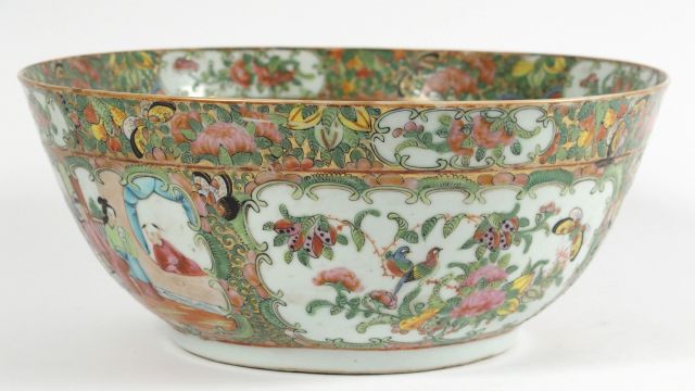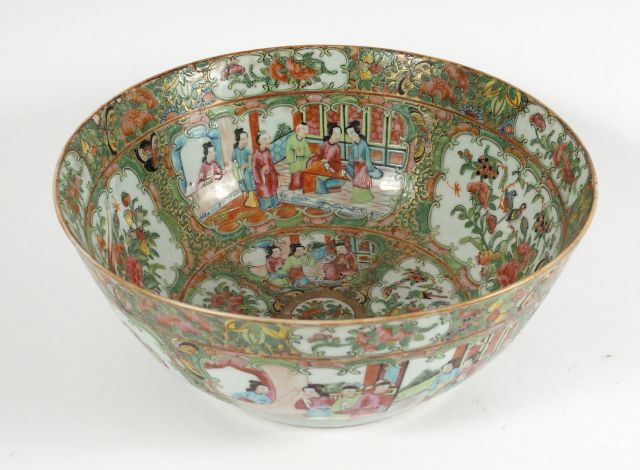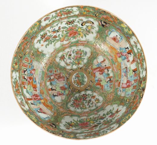 Bol à punch en porcelaine de Canton, à décor de scènes de palais, fleurs, oiseaux et végétaux. Période Guanxu. Diam. : 29,5 cm
