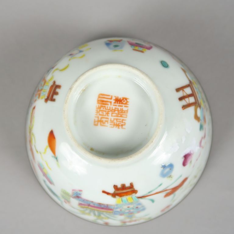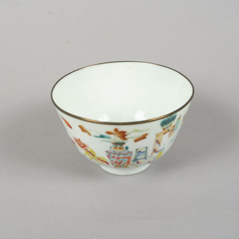 Bol en porcelaine à décor aux émaux de la famille rose, cerclé de métal. Marque apocryphe Qianlong. Chine, dynastie Qing, XIXème siècle. Diam. 10 cm