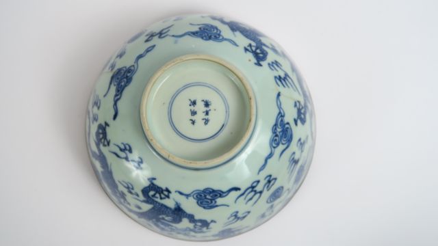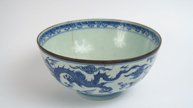 Bol en porcelaine de Hué, décor en camaïeu bleu de dragons. (fels) Diam. : 20 cm