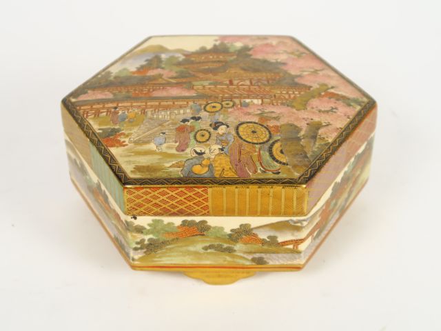 Bonbonnière couverte ortogonale en faïence de Satsuma, à décor de personnages. Japon, vers 1900. Diam. 18 cm