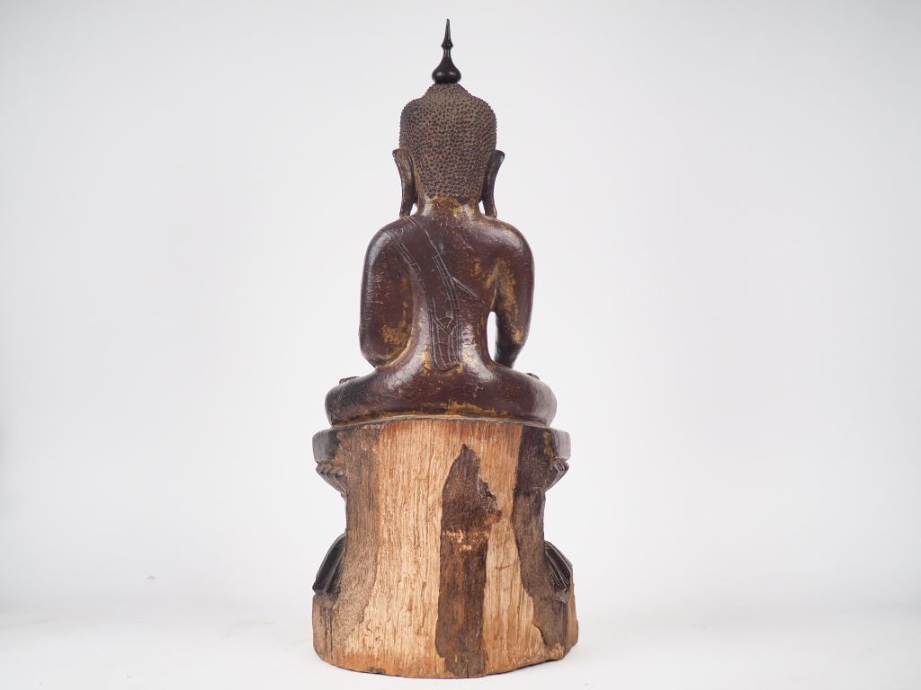 Bouddha en bois laqué brun rouge dans la position de la prise de la terre à témoin Birmanie XIXème H. 66 cm