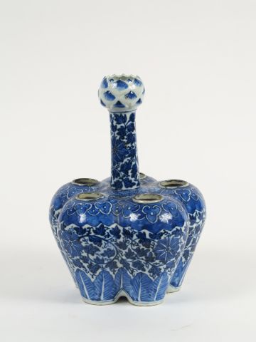 Bouquetière blanche décor bleu sous couverte de fleurs et rinceaux feuillagés. Chine, XIXème siècle. H. 26,5 cm