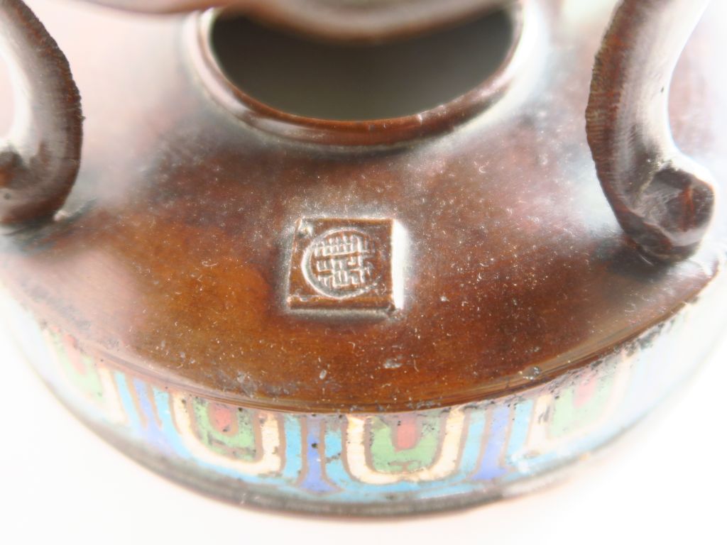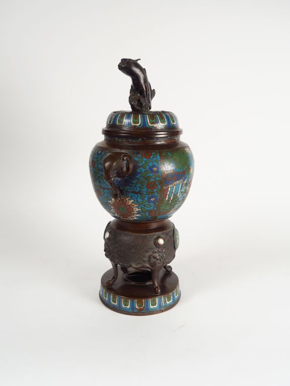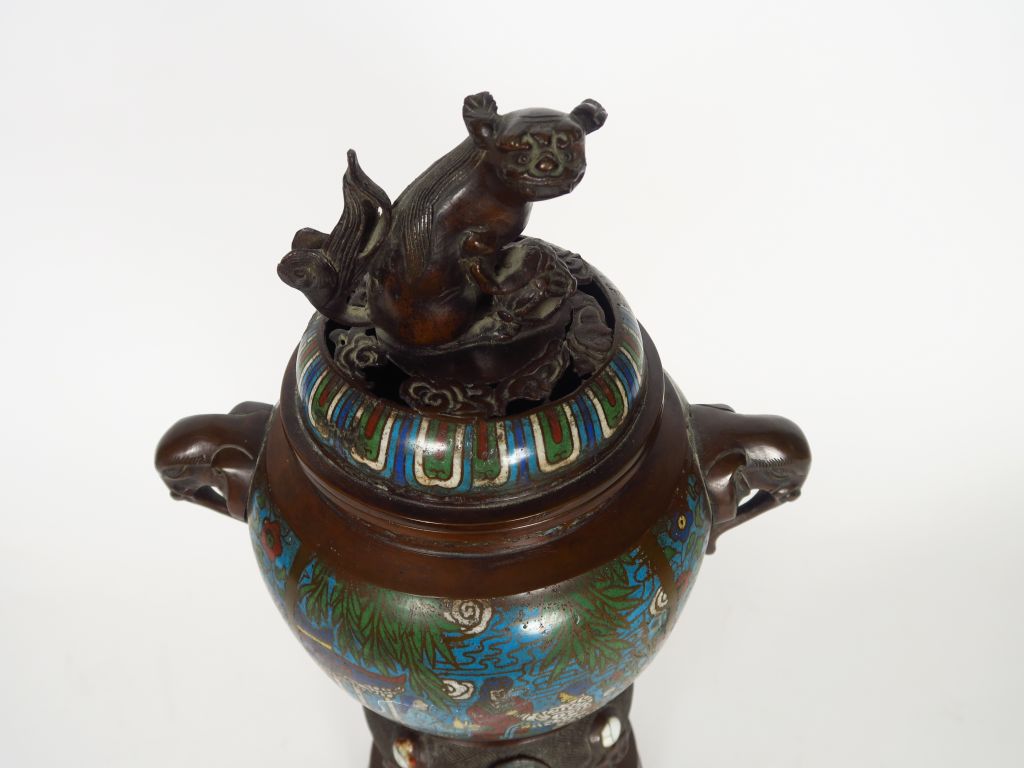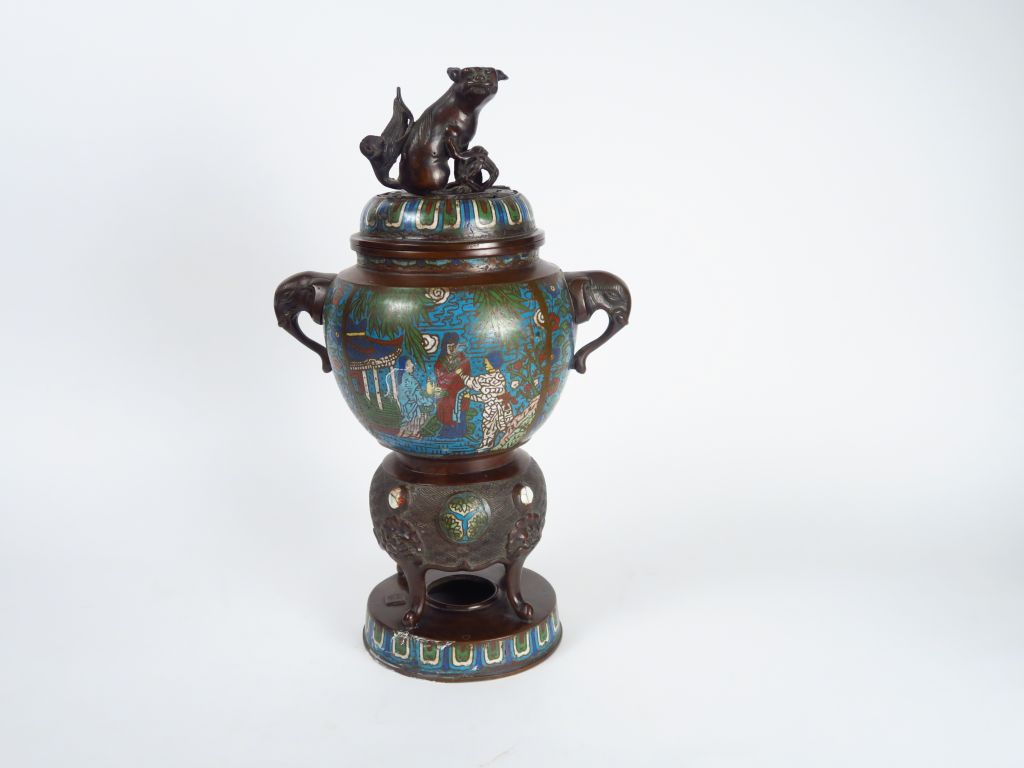 Brûle-parfum en bronze et émaux cloisonnés, anses en forme de têtes d'éléphants, prise en forme de chien de Fô. Japon, XIXème siècle. H. 46,5 cm