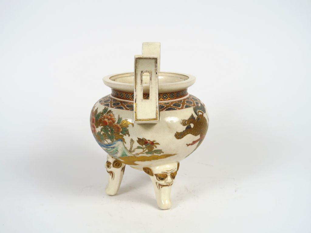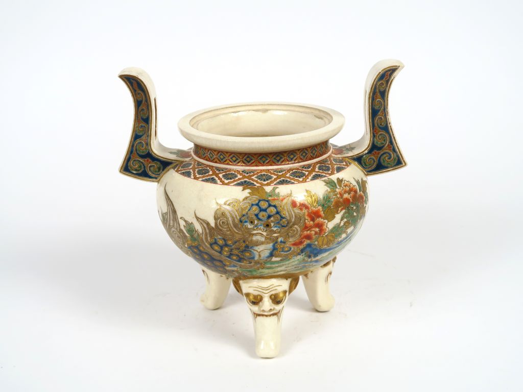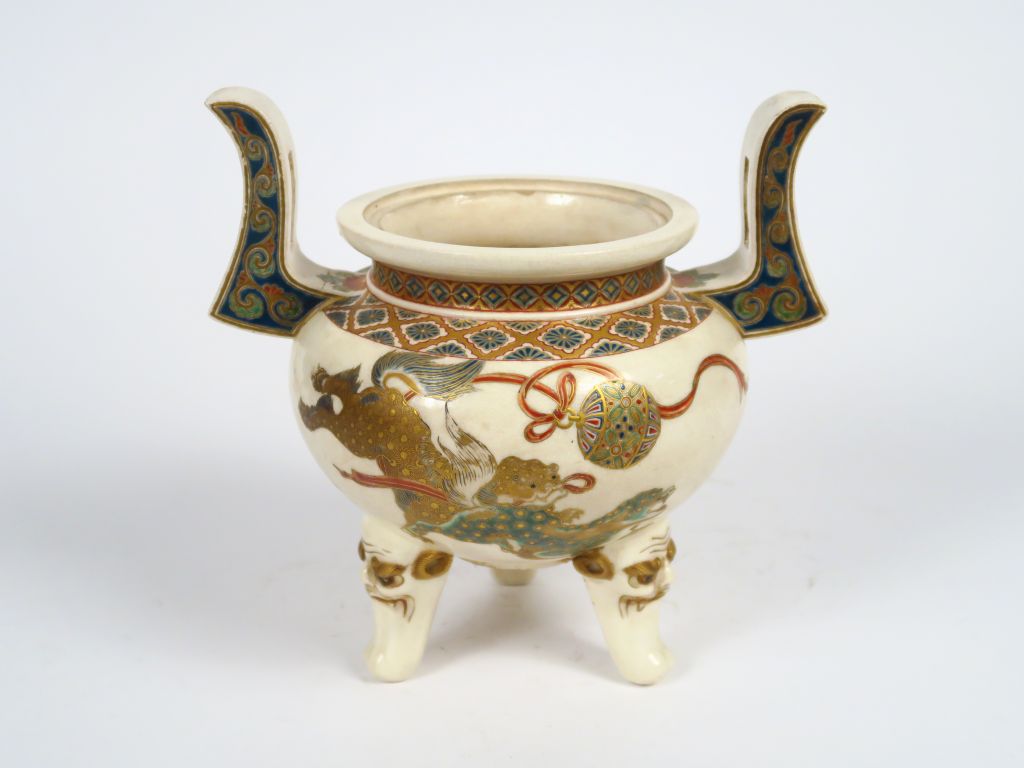 Brûle parfum en faïence de Satsuma finement décoré de shishis et de lions jouant avec le joyau sacré. Japon, vers 1900. (manque le couvercle)