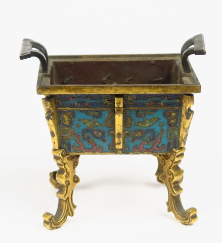 Brûle-parfum Fanding sur quatre pieds en bronze, à décor polychrome sur fond bleu de masques Taotie. Chine, XVIIème/ XVIIIème. H. 10 cm (Manque le couvercle, petites rétractations de l'émail)