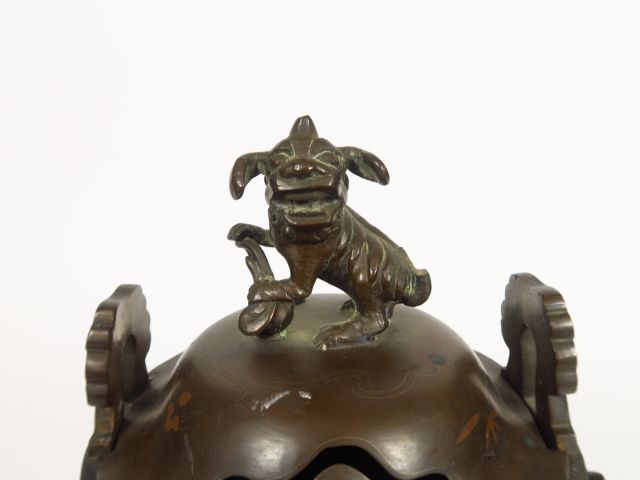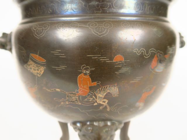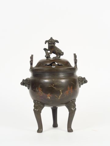 Brûle-parfum tripode en cuivre, à décor incrusté et niellé de paysages animés de personnages. Chine du Sud, vers 1900. H. 32 cm