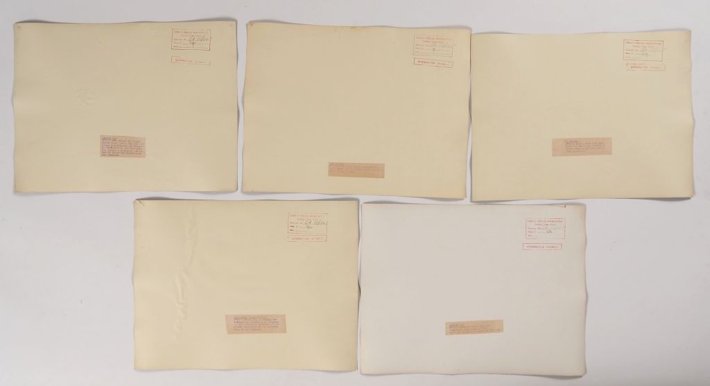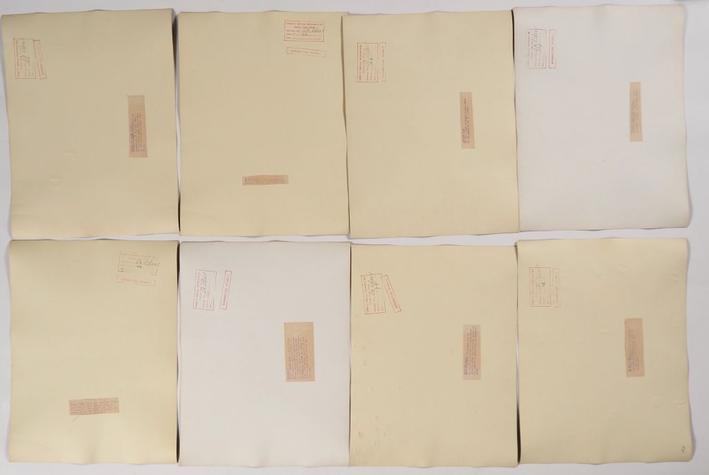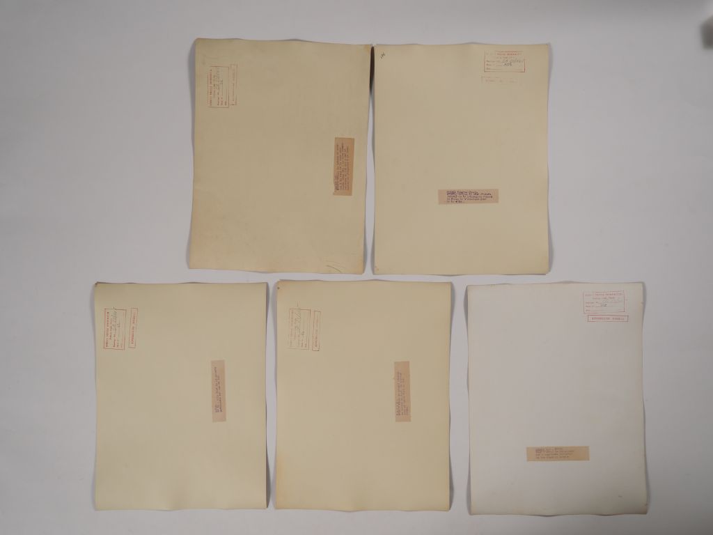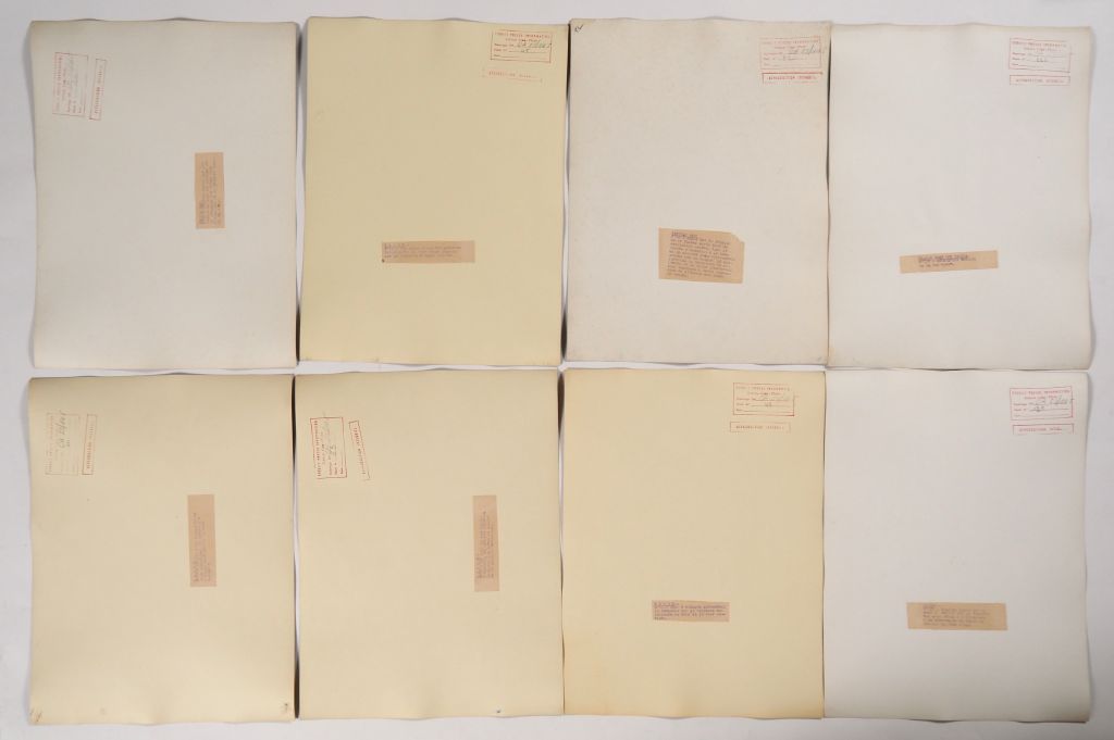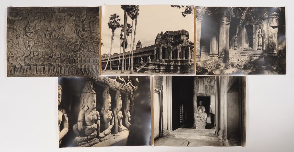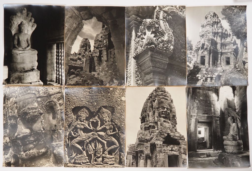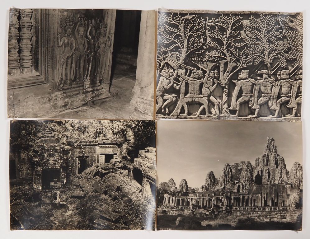Cambodge, Lot comprenant trente photos en noir et blanc, légendées au dos, de temples, de sites et représentation de bouddha, dont d’Angkor Vat, Bayon, Ankor Thom, Banteay Srei, Chau Say Tevoda, Ta Prohm, étang du Srah Srang. Les photos portent un cachet au dos service presse information et sont numérotées. Usures, légèrement gondolées. Dim. 40 X 30 cm