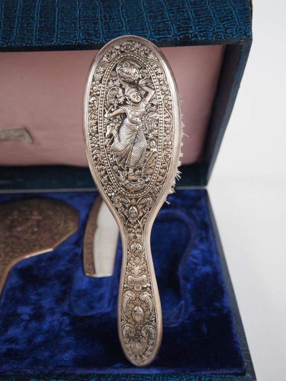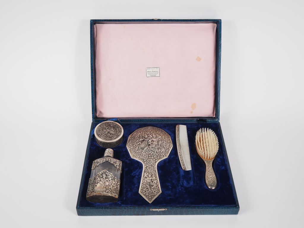 Cambodge, vers 1920 Coffret de voyage ou nécessaire de toilettes, contenant peigne, brosse, miroir et petit flacon à parfum en argent. Marque Heng-Buon-Xieu – Phnom Penh. Dim. 7,5 x 40,5 x 31,5 cm