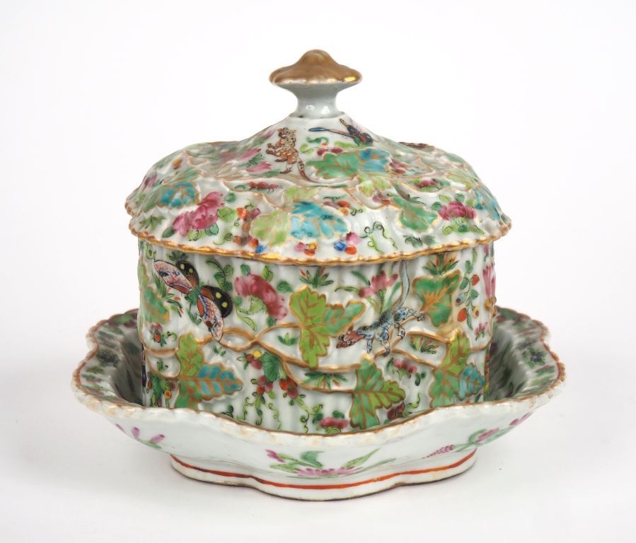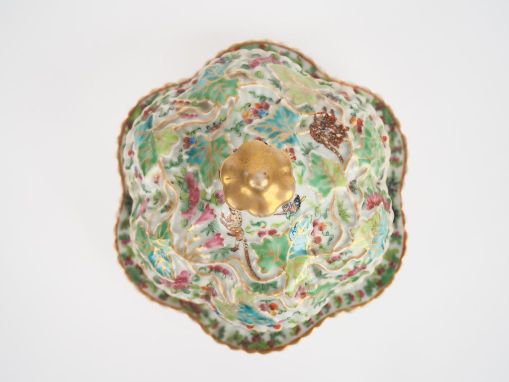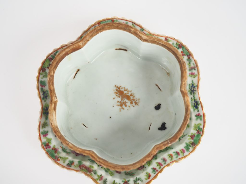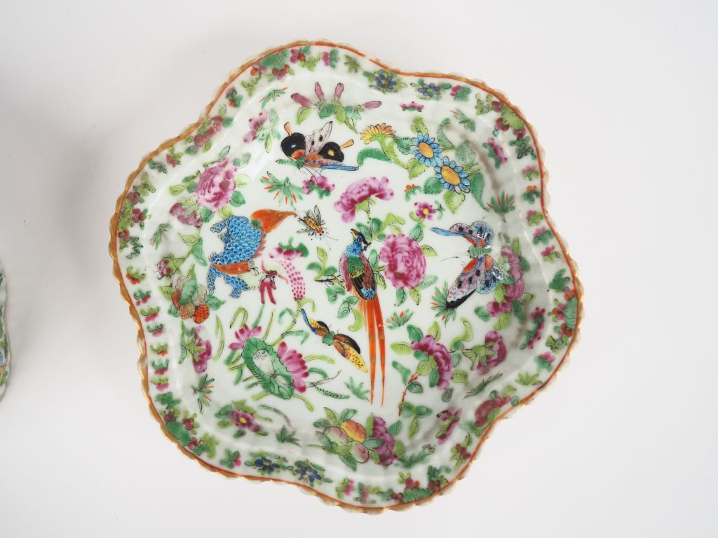 Canton fin XIXe siècle, Bonbonnière couverte et son présentoir à bords polylobés, en porcelaine et émaux de la famille rose, à décor d’un faisan, animal fantastique, papillons et fleurs. Dim. 16,5 x 20 cm
