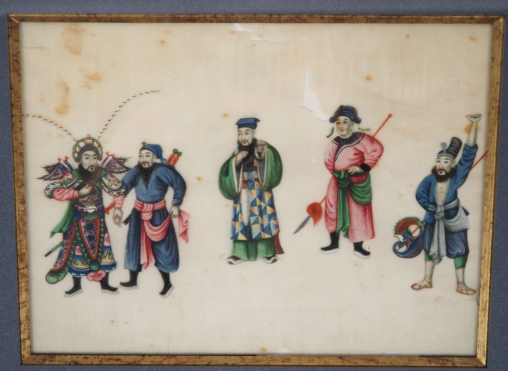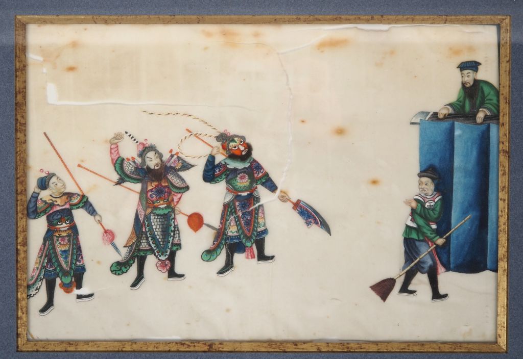 Canton, fin XIXe siècle, Trois gouaches sur papier de riz représentant métier, scène de jugement…. Mauvais état pour deux. Dim. 18 x 12 cm et 19 x 26 cm