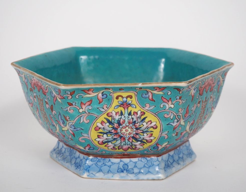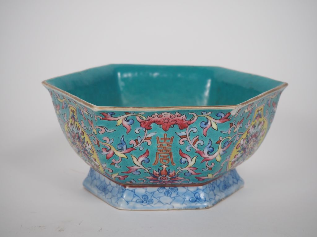 Chine, 2ème moitié du XIXe siècle Coupe hexagonale sur piédouche, finement décorée en émaux de la famille rose sur fond bleu turquoise de chauve-souris, fleurs de lotus, caractères fu et tiges feuillagées. Marque en zhuanshu sur la base. Diam. 19 cm (Eclat)
