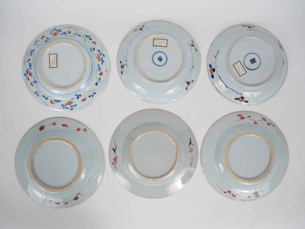 Chine, Compagnie des Indes, XVIIIe siècle Ensemble de porcelaines en émaux dit « imari chinois » comprenant une paire à décor de lotus stylisés et rinceaux feuillagés, un autre à motif similaire, et trois autres ornées de fleurs de pivoines, chrysanthèmes et tiges feuillagées. Diam. 22 à 22,5 cm (Petites égrenures, fels)