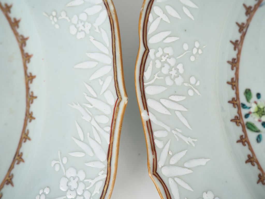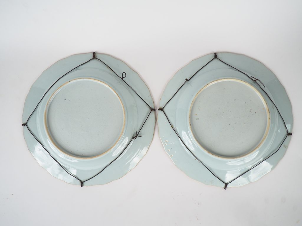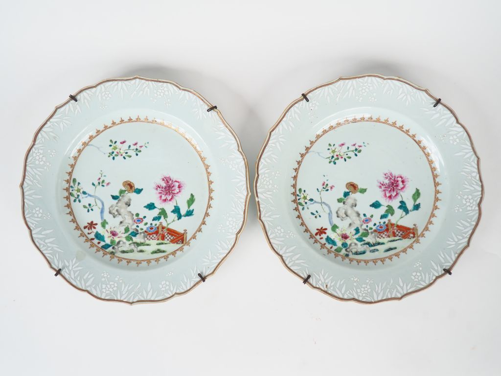 Chine, Compagnie des Indes, XVIIIe siècle, Qianlong, Paire de plats floriformes en porcelaine et émaux famille rose, décor en médaillon central d'un pivoinier en fleur, l'aile décorée de bambous et fleurs de prunus en léger relief. Diam. 32 cm (quelques éclats et égrenues)