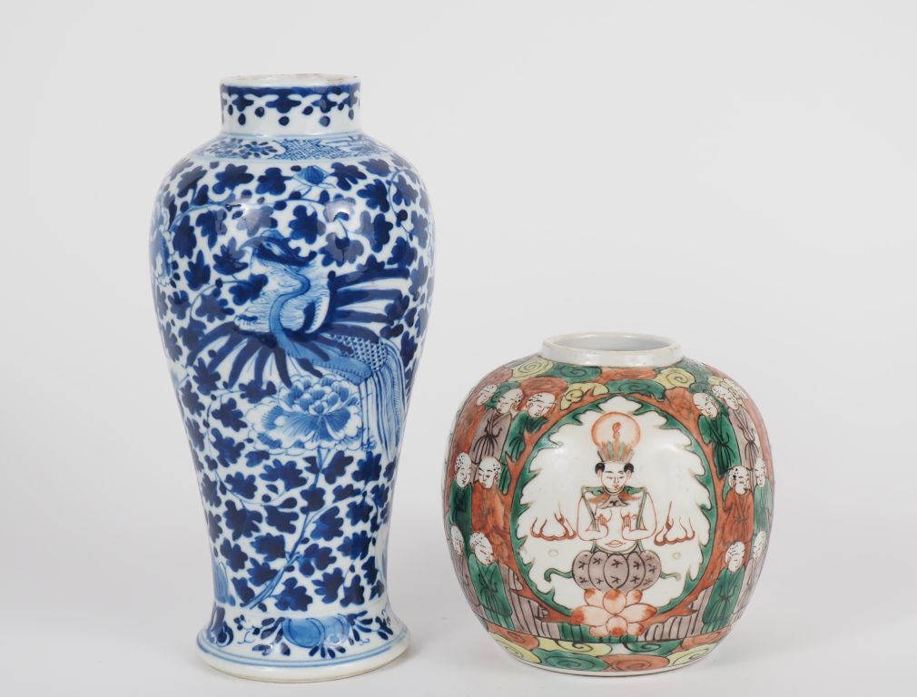 Chine, début XXe siècle Lot comprenant un vase balustre bleu blanc, à décor d’un oiseau paradis évoluant parmi des pivoines en fleurs (fels) , et un pot globulaire en porcelaine et émaux de style famille verte, orné de bouddhas et lohans, avec marque apocryphe Kangxi. H. 22,5 et 13 cm