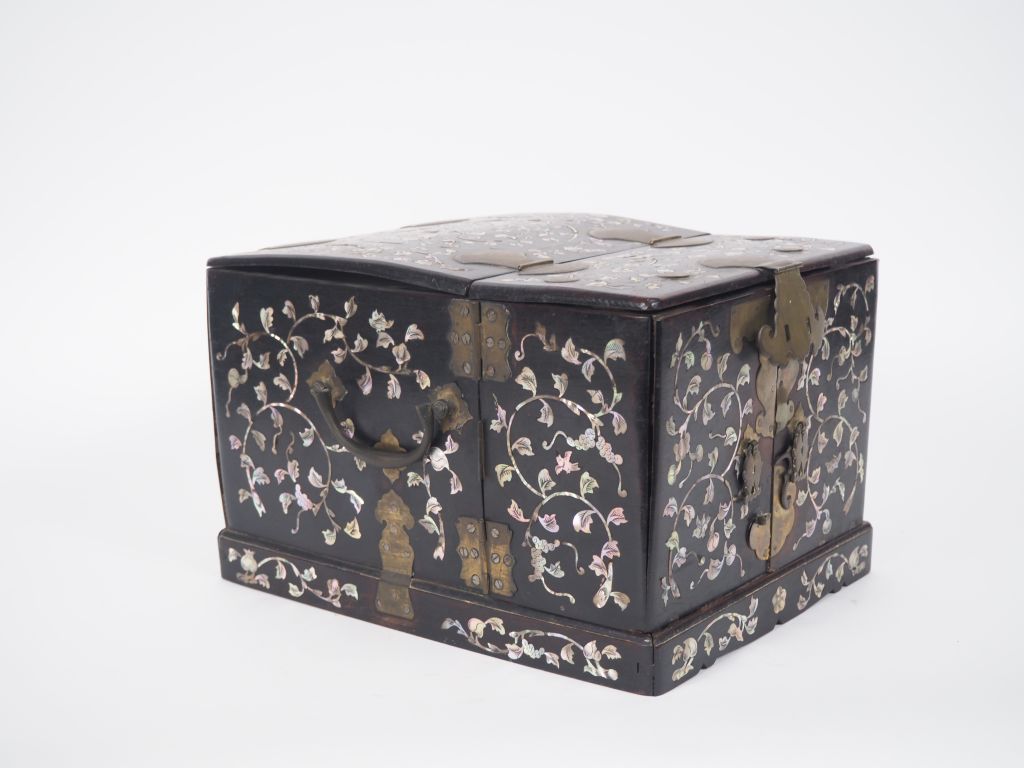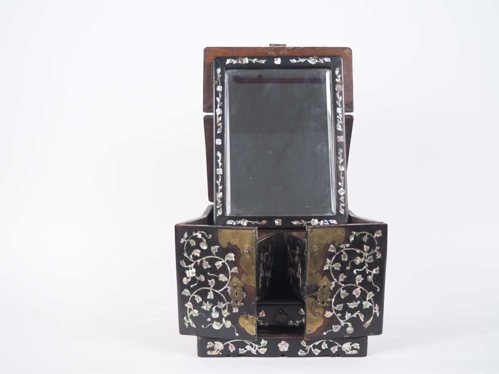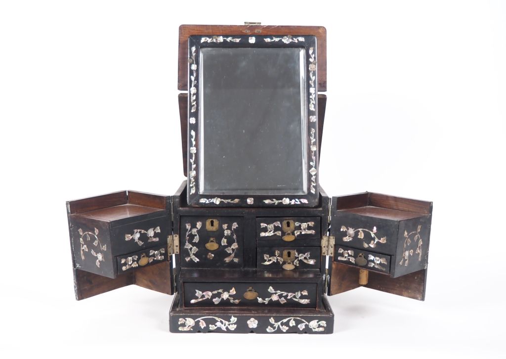 Chine du Sud, vers 1920, Coiffeuse de voyage ouvrant à deux portes sur six tiroirs et un miroir en bois à décor en marqueterie de nacre de rinceaux feuillagés. Dim. 19,5 x 31 x 23 cm