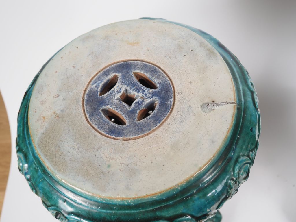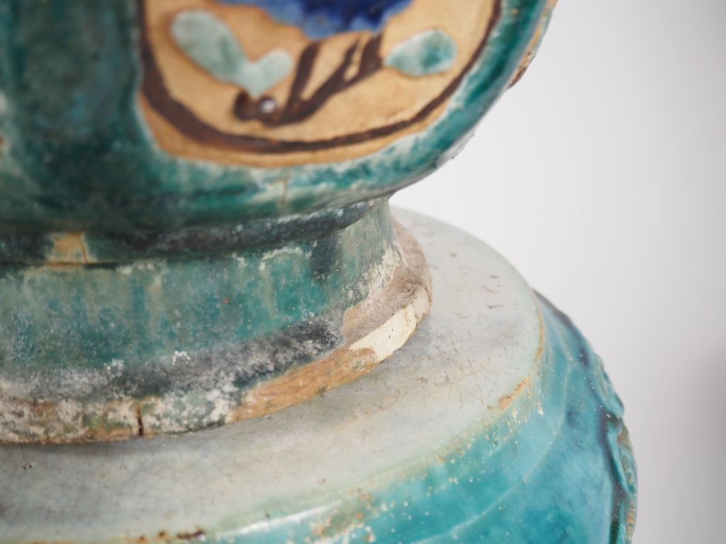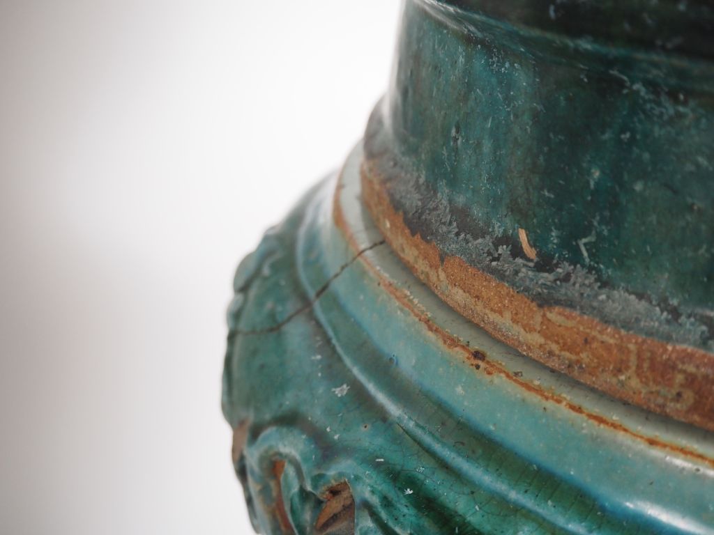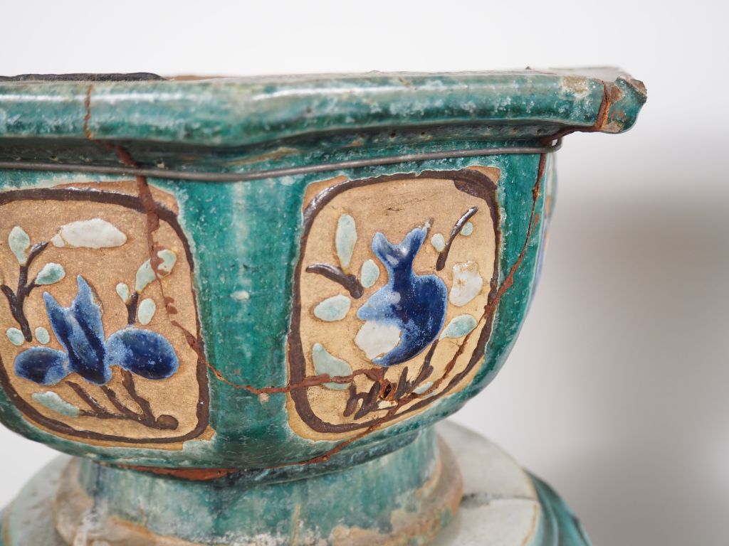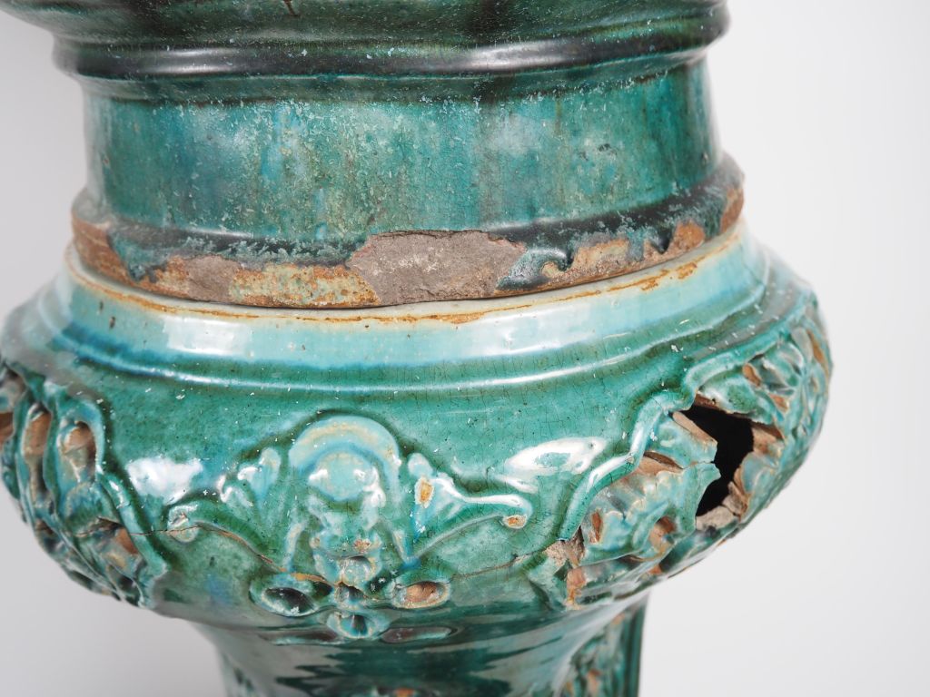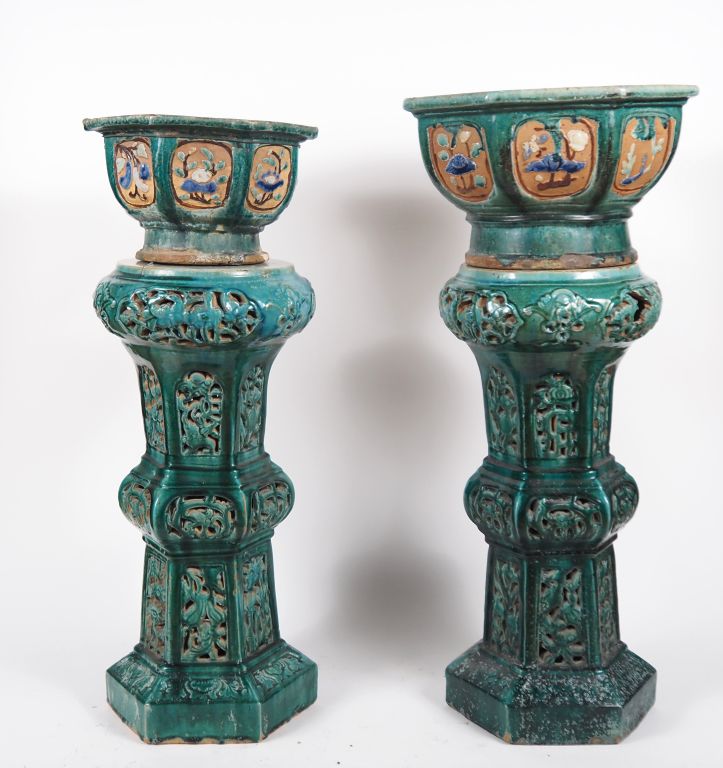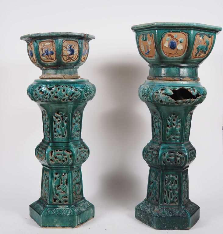 Chine du Sud, Vietnam, fin XIXe début XXe siècle, Deux sellettes en céramique émaillée verte à décor ajouré de feuillages, supportant deux grandes jardinières, de forme octogonale, en céramique émaillée vert, brun et bleu à décor de grandes et courges… Accidents et restaurations. H. sellette 67 cm