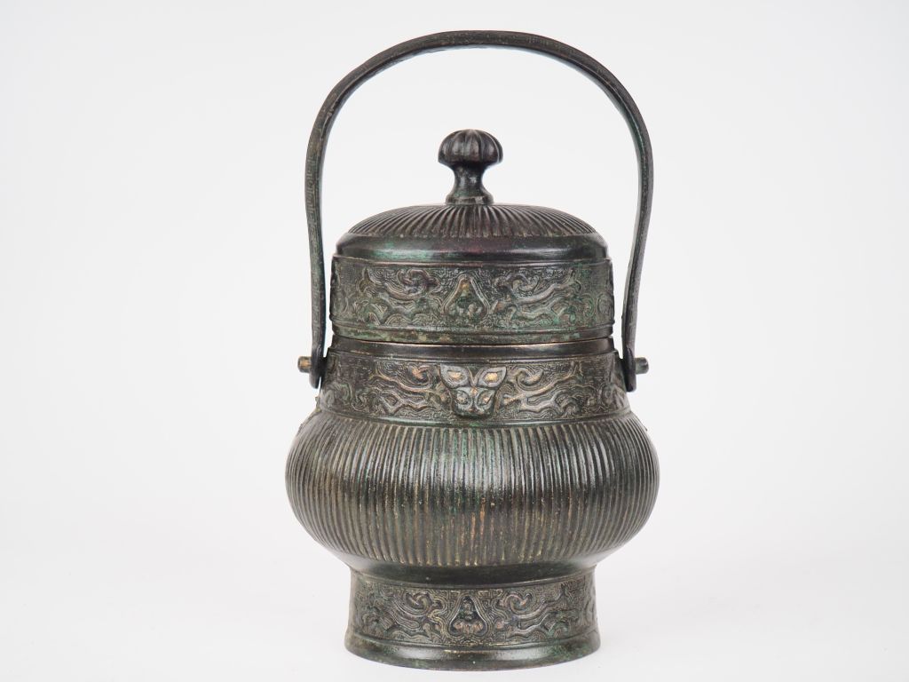 Chine, époque Ming Vase Hu couvert en bronze de patine brune soutenu par une anse, à décor en léger relief de masques animaliers, de phénix stylisés, graphismes archaisant à l'intérieur. H. 31 cm Chocs et enfoncements, manques